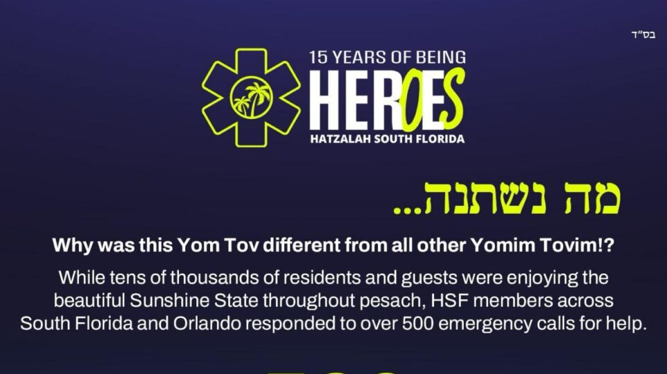 Latest Stories Hatzalah South Florida Answers Over 500 Calls During Busy Pesach Week As thousands of visitors from around the globe flocked to South Florida to celebrate Pesach under the warm Sunshine State skies, Hatzalah South Florida was working around the clock to keep the community safe.... April 25, 2025