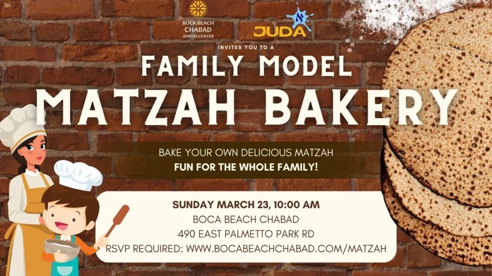 Latest Stories Family Model Matzah Bakery! oin Boca Beach Chabad for a hands-on Family Model Matzah Bakery! Learn, bake, and taste your very own delicious matzah—fun for all ages! Sunday, March 23, 202510:00 AMBoca Beach Chabad 490 E Palmetto Park... March 17, 2025