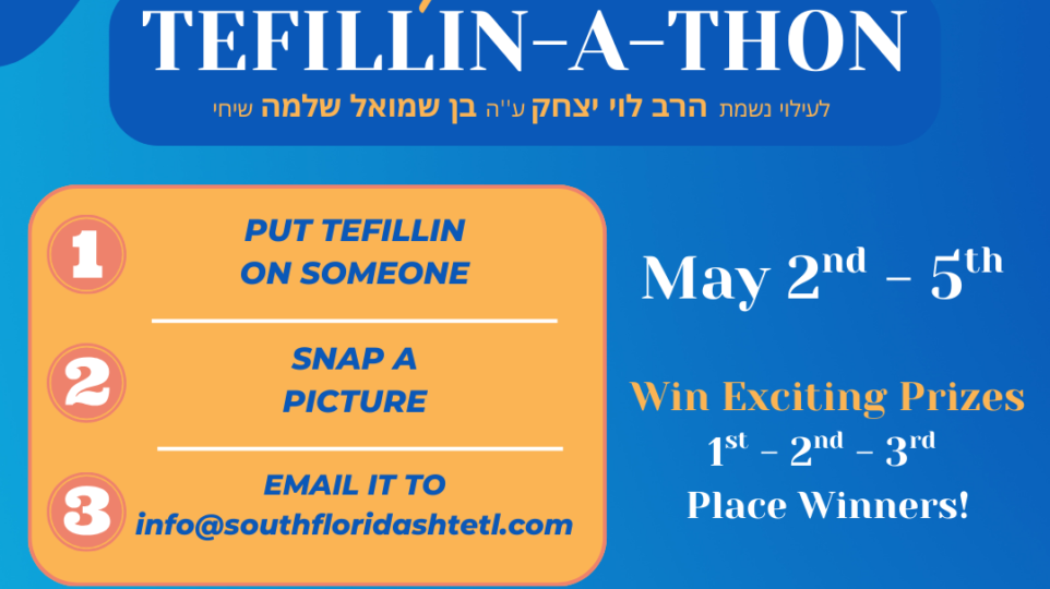 Hero Story 2 Tefillin-a-thon: In Memory of Rabbi Levi Bialo’s Yartzeit In Loving Memory of Rabbi Levi Bialo OBM Honoring Him and his legacy on his 20th Yahrzeit With 200 Tefillin! Join us for a Special Tefillin-a-thon For bochurim & children of all ages (adults... May 2, 2025