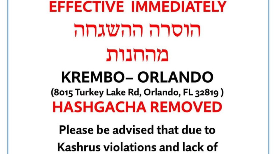 Latest Stories Kashrus Alert: RCF Removes Certification from Krembo in Orlando The Rabbinate of Central & North Florida (RCF) has issued a Kashrus alert announcing the immediate removal of its supervision from Krembo, located at 8015 Turkey Lake Road, Orlando, FL 32819. According to the RCF, the... May 2, 2025