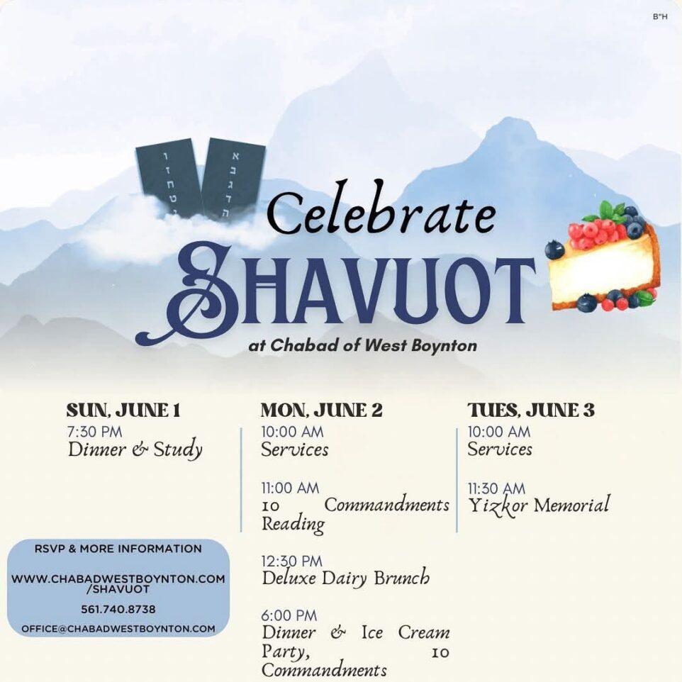 Join us for a meaningful and joyful Shavuot filled with inspiration, tradition, and delicious dairy delights! Sunday, June 1🕢 7:30 PM – Dinner & Study Monday, June 2🕙 10:00 AM – Services🕚 11:00 AM – Reading of the 10 Commandments🧀 12:30 PM – Deluxe Dairy Brunch🍦 6:00 PM – Dinner & Ice Cream Party + 10 Commandments Tuesday, June 3🕙 10:00 AM – Services🕦 11:30 AM – Yizkor Memorial 📍Chabad of West Boynton📞 561.740.8738🌐 www.chabadwestboynton.com/shavuot📧 office@chabadwestboynton.com Bring your family, invite your friends, and let’s celebrate the giving of the Torah together! ✨