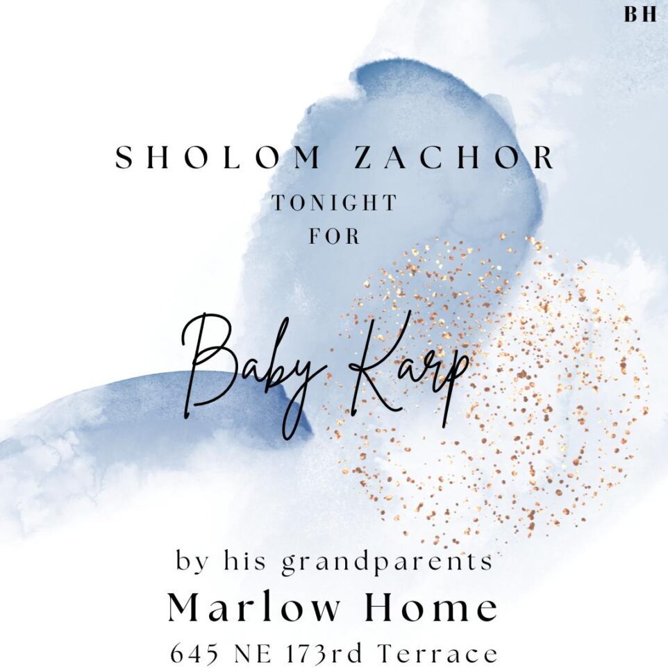 NORTH MIAMI BEACH, FL — The community is warmly invited to attend a Sholom Zachor tonight in honor of Baby Karp, hosted by his proud grandparents at the Marlow Home. 📍 645 NE 173rd Terrace🗓️ Tonight This meaningful tradition welcomes friends and family to celebrate the birth of a baby boy on the first Friday night after his arrival. It’s a time of joy, blessings, and gathering in warmth and unity. Please join in extending blessings and sharing in the simcha. Mazal Tov to the entire Karp and Marlow families!