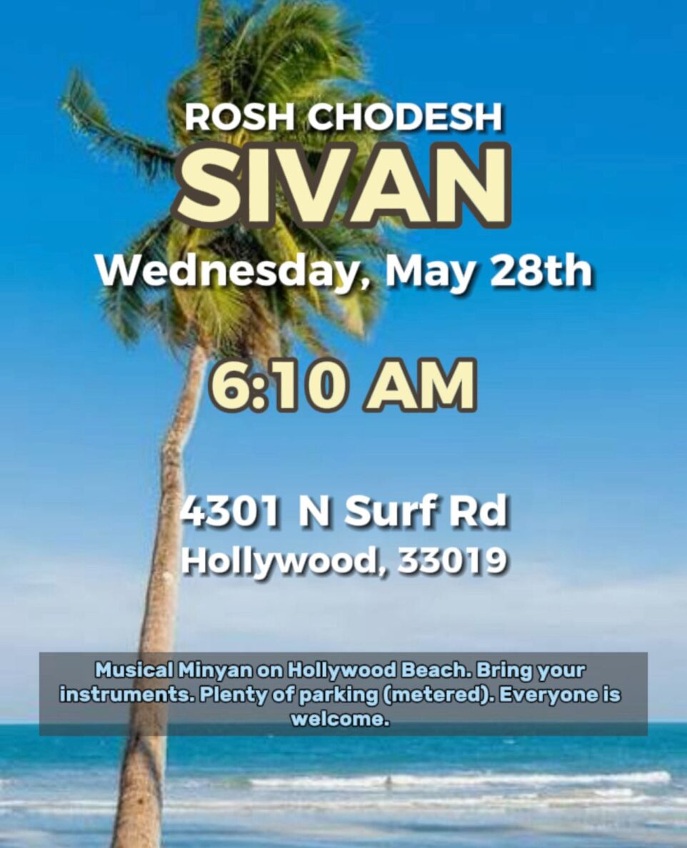 Start the new month with spirit and song at a special Rosh Chodesh Sivan Musical Minyan, taking place on the serene shores of Hollywood Beach. 🗓 Date: Wednesday, May 28🕕 Time: 6:10 AM📍 Location: 4301 N Surf Rd, Hollywood Beach, FL 33019 This uplifting outdoor tefillah will feature live music and communal prayer in a beautiful beach setting. Participants are encouraged to bring their own instruments and join in the celebration as we usher in the month of Sivan with heartfelt davening and joyous song. All are welcome to take part in this meaningful and inspiring experience.Metered parking is available nearby. Let’s welcome Rosh Chodesh together—with music, community, and connection.