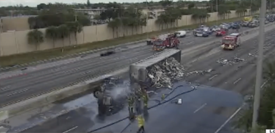 Fire erupted after a tractor trailer tipped over on the Florida Turnpike, causing traffic in both directions to be greatly impacted. It happened on the southbound lanes of the Turnpike near the Commercial Boulevard exit. A dump truck trailer carrying scrap metal was traveling in the northbound lanes when the driver lost control and rolled over the median onto the southbound lanes, spilling its load and catching fire. A second vehicle was involved in the crash, according to Tamarac Fire Rescue. Traffic cameras show that traffic had been stopped both ways as crews worked to extinguish the flames. One northbound lane has since been opened. Both drivers are ok.
