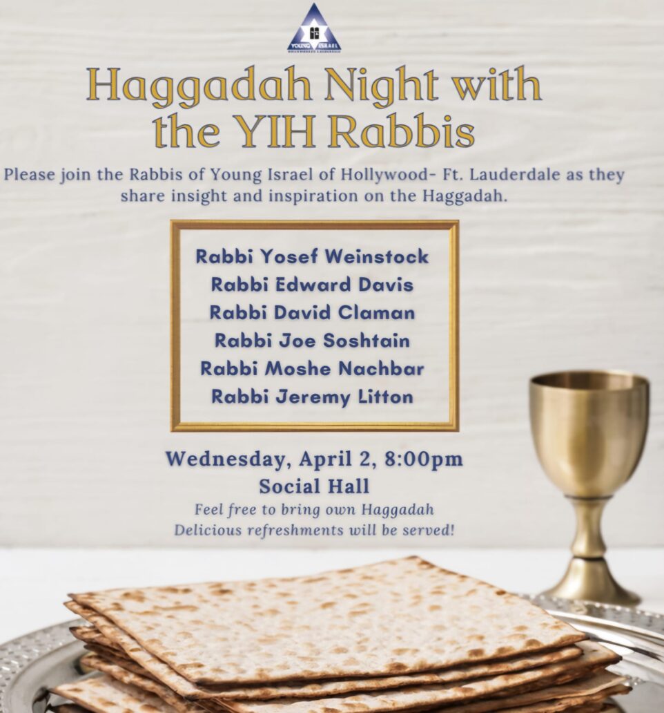 Join the Rabbis of Young Israel of Hollywood-Ft. Lauderdale for an evening of insight and inspiration on the Haggadah. Wednesday, April 2 at 8:00 PMIn the Social Hall Bring your own Haggadah if you'd like!Delicious refreshments will be served.
