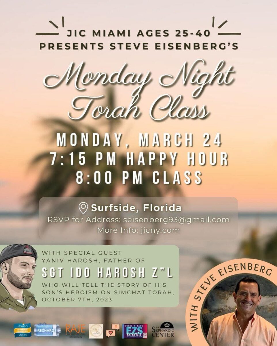 MONDAY NIGHT TORAH CLASSWith Special GuestYaniv Harosh, Father of SGT Ido Harosh Z"L Yaniv Harosh will share the incredible story of his son's heroism on Simchas Torah, October 7th, 2023. Date: Monday, March 24th7:15 PM - Happy Hour8:00 PM - Torah Class RSVP for address at seisenberg93@gmail.com