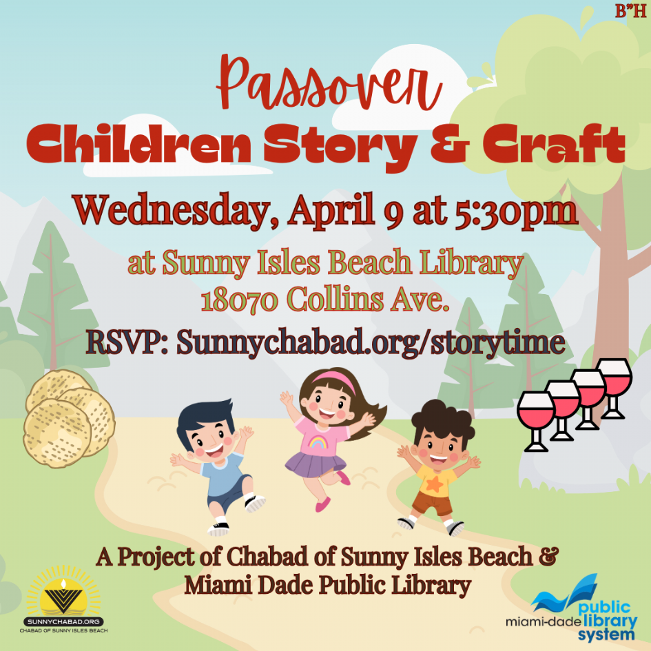 Get ready for an exciting and festive evening! Join us on Wednesday, April 9 at 5:30 PM at the Sunny Isles Library, located at 18070 Collins Avenue, for a delightful pre-Passover story and craft event. Kids will be enchanted by an interactive Passover story, followed by a creative craft session where they’ll design their very own beautiful Afikomen bags—perfect for adding a personal touch to your seder table! Bring your friends and family along for an unforgettable evening! Don’t forget to RSVP at Sunnychabad.org/storytime. We can’t wait to see you there!