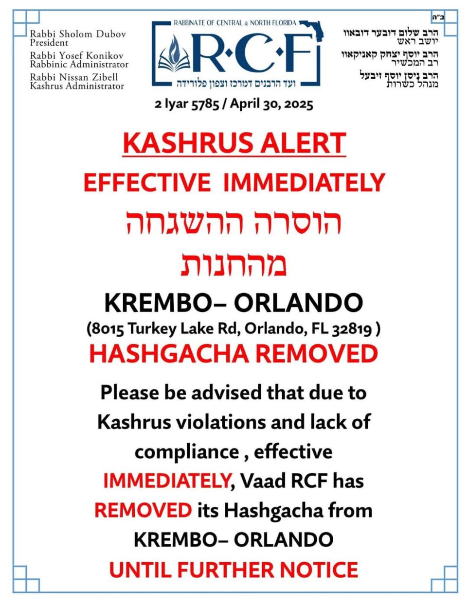 The Rabbinate of Central & North Florida (RCF) has issued a Kashrus alert announcing the immediate removal of its supervision from Krembo, located at 8015 Turkey Lake Road, Orlando, FL 32819. According to the RCF, the decision was made due to Kashrus violations and non-compliance with established standards. As a result, Krembo is no longer under any Hechsher until further notice. Consumers are advised to take appropriate precautions and refrain from relying on previous certification.