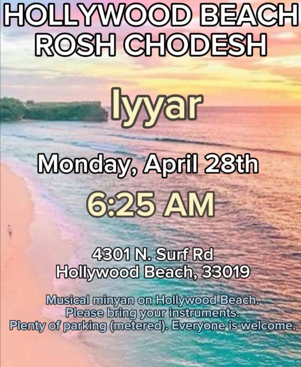 Join us for Rosh Chodesh Iyyar davening on Monday, April 28th at Hollywood Beach! Location:4301 N. Surf Rd, Hollywood Beach, FL 33019 Please note:In honor of Sefira, there will be no instruments — only the beautiful sound of our voices. Plenty of metered parking is available.Everyone is welcome! Chodesh Tov!