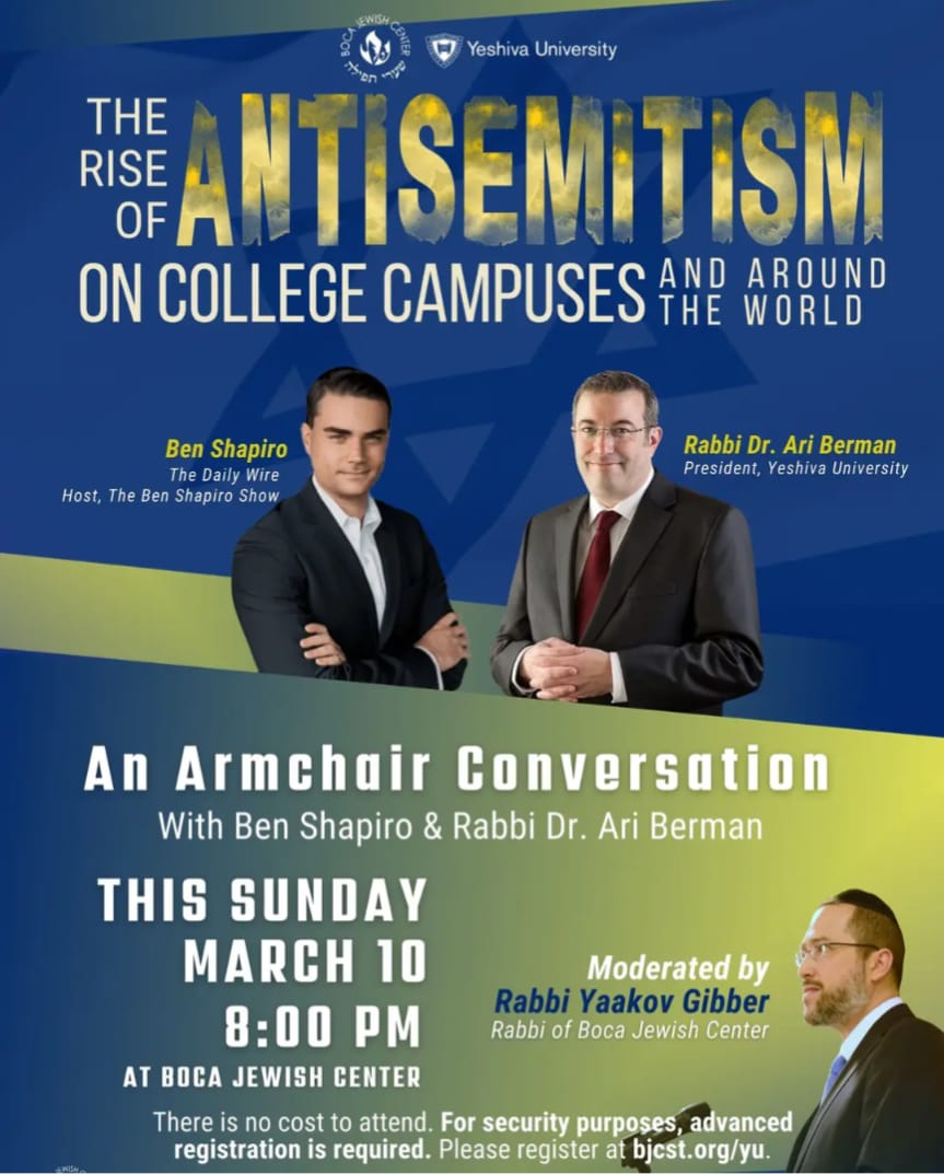 This Sunday - Armchair Conversation with Rabbi Dr. Ari Berman & Ben Shapiro at BJC Join us this Sunday, March 10, at 8:00 pm at BJC for a special Armchair Conversation with Rabbi Dr. Ari Berman, President of Yeshiva University, and Ben Shapiro, on the topic "The Rise of Antisemitism on College Campuses and Around the World". This conversation will be moderated by Rabbi Gibber. There is no cost to attend. However, for security purposes, advanced registration is required. Please visit bjcst.org/yu to register today!